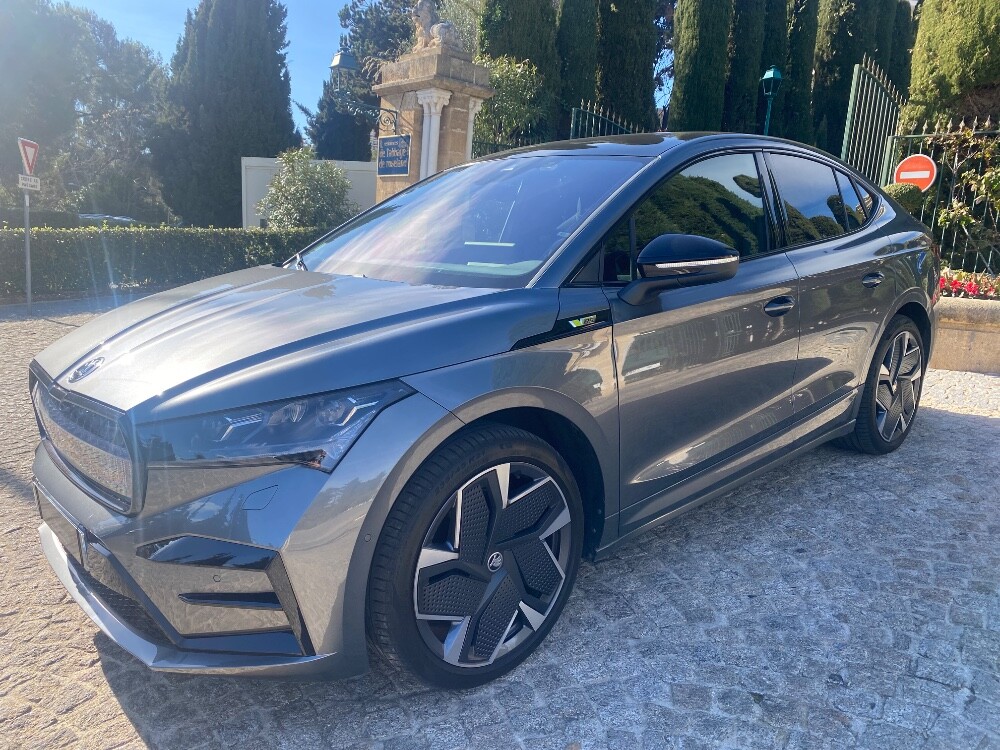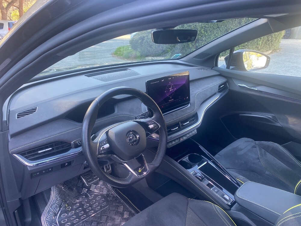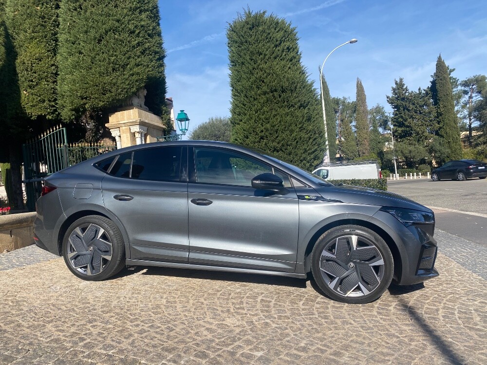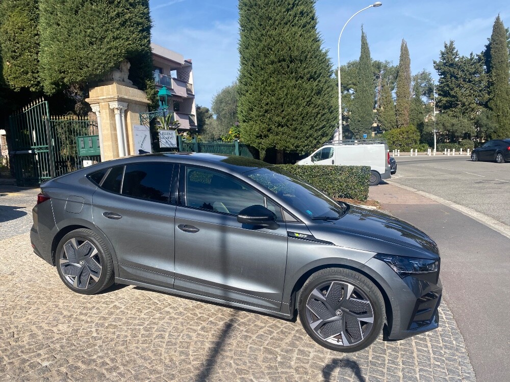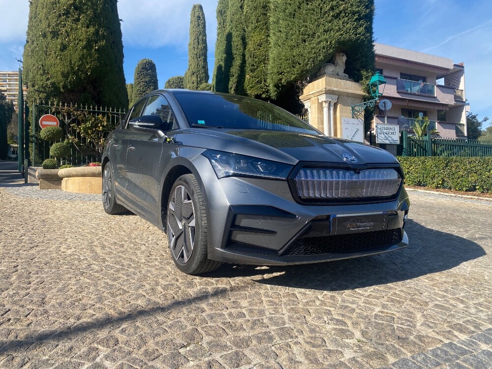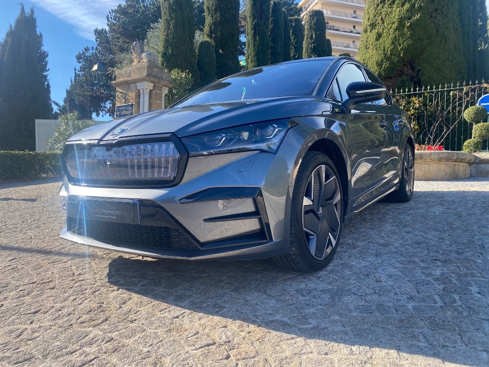 L’Agence Auto Premium vous Propose ce magnifique ENYAQ Coupé iV RS, version la plus sportive et aboutie de la gamme, combinant performance, technologie et confort premium. Mise en circulation le 05 septembre 2023, affichant seulement 13 219 km, le véhicule est dans un état irréprochable. Performance & Technologie * 299 ch – Transmission intégrale intelligente (4x4) * Batterie 82 kWh * Autonomie jusqu’à 500 km (WLTP) * 0 à 100 km/h en 6,5 secondes * Recharge rapide DC jusqu’à 135 kW * Conduite silencieuse, souple et extrêmement dynamique Finition RS – Configuration Premium * Intérieur RS sport avec sellerie suédine/cuir et surpiqûres vertes * Sièges chauffants * Volant sport chauffant * Écran central 13’’ + cockpit digital * Matrix LED * Caméra de recul + radars AV/AR * Régulateur adaptatif (ACC) * Aides à la conduite complètes * Hayon électrique * Jantes alliage RS * Toit panoramique * Apple CarPlay / Android Auto État & Garanties * Véhicule très récent (09/2023) * Faible kilométrage : 13 219 km * Garantie constructeur en cours * Batterie garantie 8 ans / 160 000 km * Aucun frais à prévoir * Non fumeur * Double des clés SUV coupé au design affirmé, prestations premium, performances sportives et coût d’usage maîtrisé. Un excellent compromis entre dynamisme et confort familial. Visible sur rendez vous a Nice Dossier photo complet sur demande