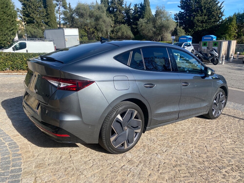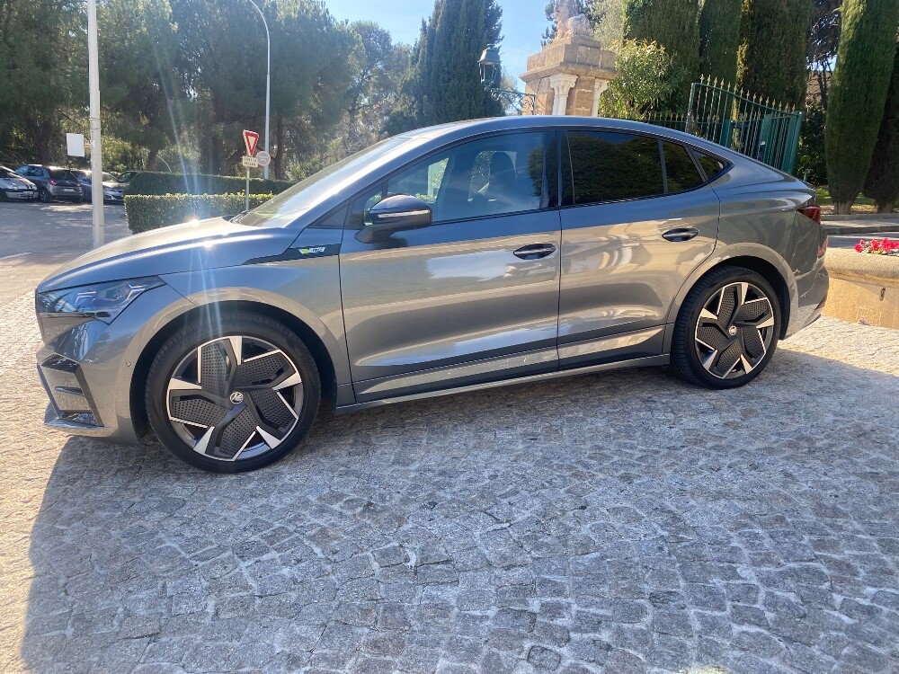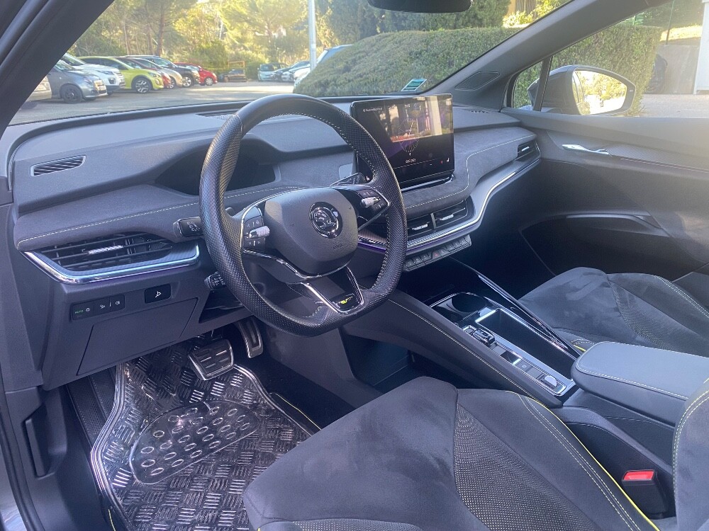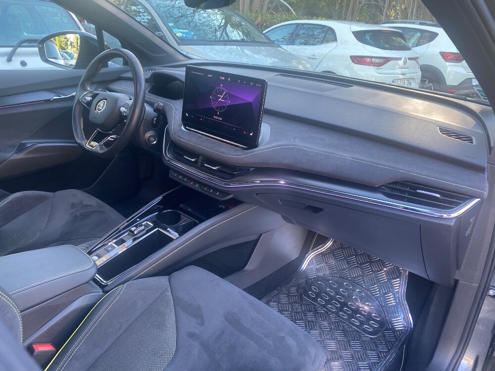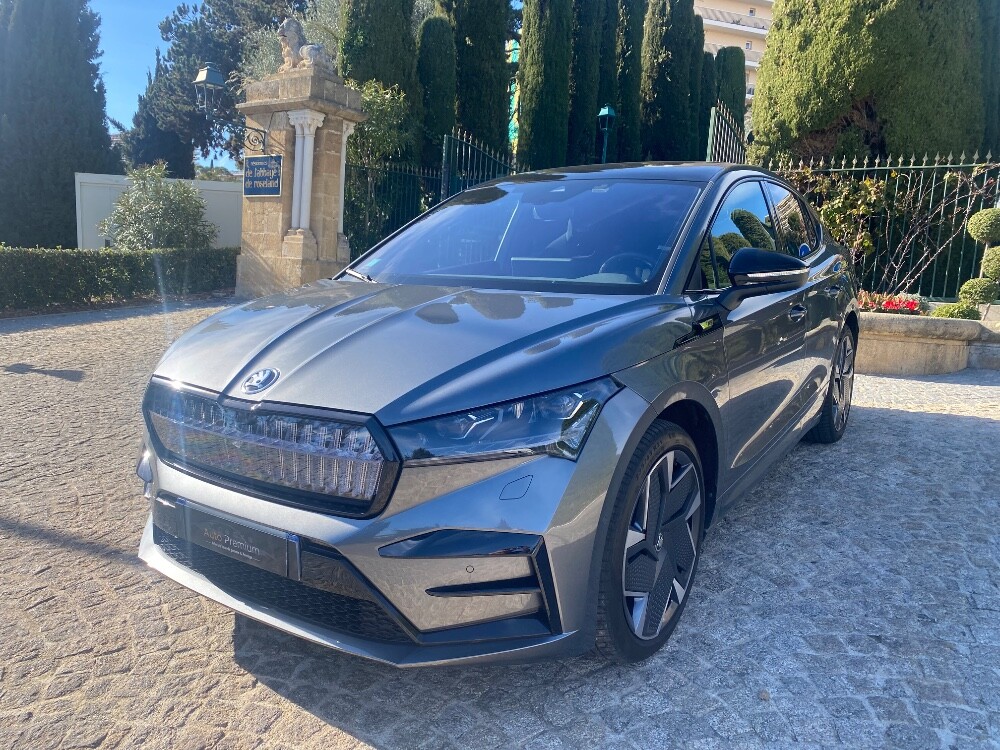 L’Agence Auto Premium vous Propose ce magnifique ENYAQ Coupé iV RS, version la plus sportive et aboutie de la gamme, combinant performance, technologie et confort premium. Mise en circulation le 05 septembre 2023, affichant seulement 13 219 km, le véhicule est dans un état irréprochable. Performance & Technologie * 299 ch – Transmission intégrale intelligente (4x4) * Batterie 82 kWh * Autonomie jusqu’à 500 km (WLTP) * 0 à 100 km/h en 6,5 secondes * Recharge rapide DC jusqu’à 135 kW * Conduite silencieuse, souple et extrêmement dynamique Finition RS – Configuration Premium * Intérieur RS sport avec sellerie suédine/cuir et surpiqûres vertes * Sièges chauffants * Volant sport chauffant * Écran central 13’’ + cockpit digital * Matrix LED * Caméra de recul + radars AV/AR * Régulateur adaptatif (ACC) * Aides à la conduite complètes * Hayon électrique * Jantes alliage RS * Toit panoramique * Apple CarPlay / Android Auto État & Garanties * Véhicule très récent (09/2023) * Faible kilométrage : 13 219 km * Garantie constructeur en cours * Batterie garantie 8 ans / 160 000 km * Aucun frais à prévoir * Non fumeur * Double des clés SUV coupé au design affirmé, prestations premium, performances sportives et coût d’usage maîtrisé. Un excellent compromis entre dynamisme et confort familial. Visible sur rendez vous a Nice Dossier photo complet sur demande